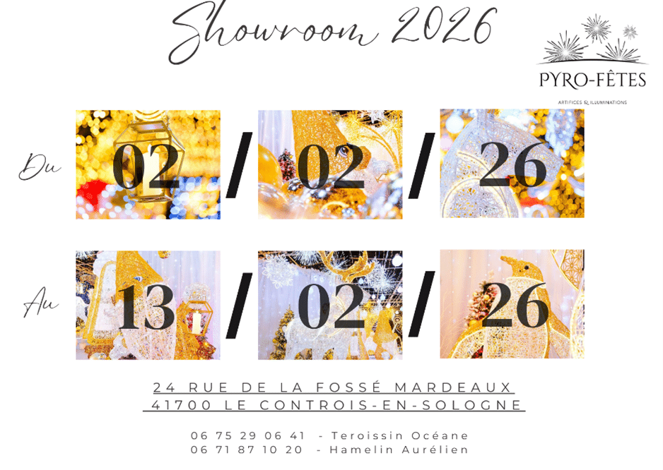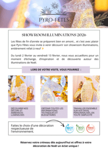 Du lundi 2 février au vendredi 13 février, Pyro Fêtes vous accueille dans son showroom illuminations entièrement rénové, spécialement conçu pour vous faire découvrir ses décors lumineux de Noël et solutions d’illuminations festives.